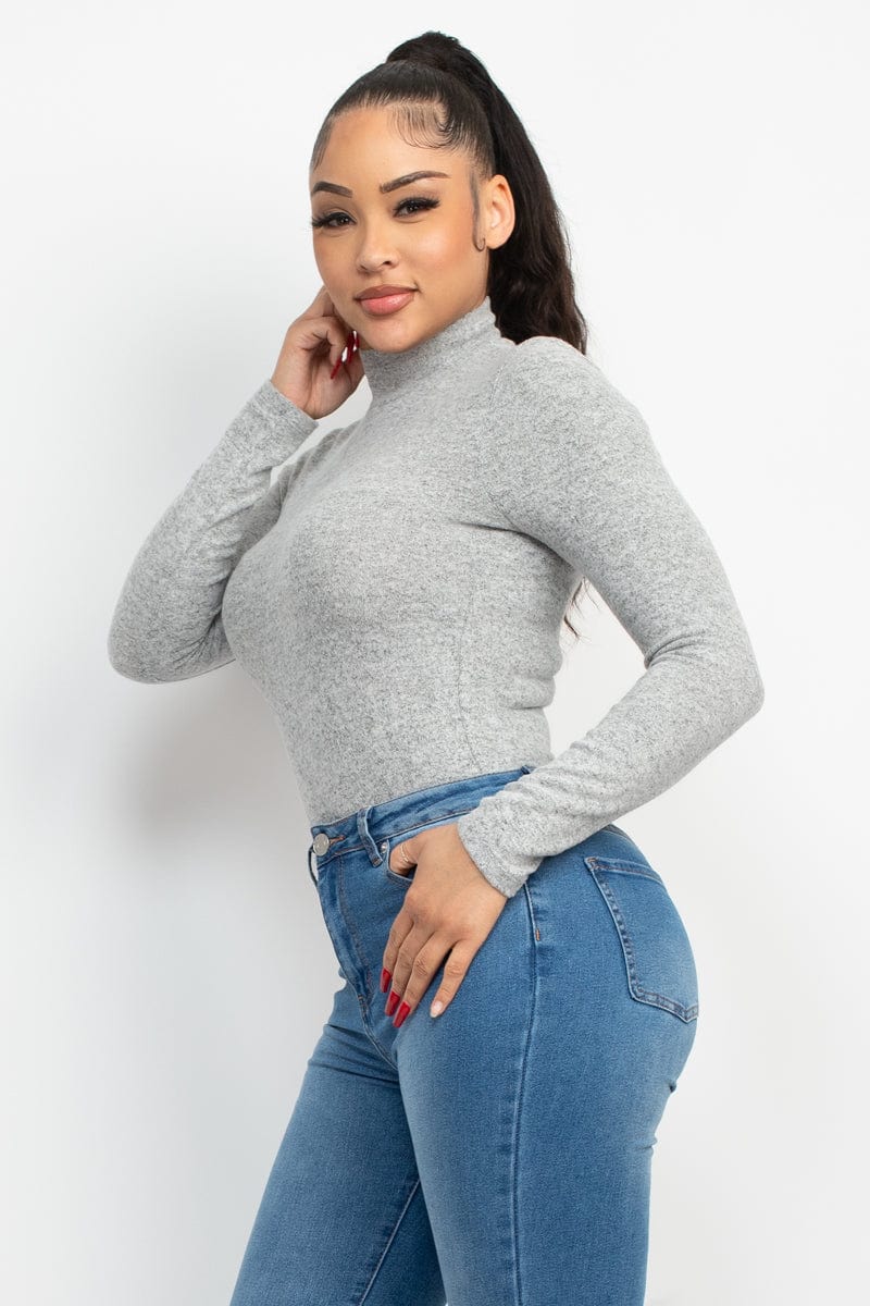 Una blusa de punto de moda con mangas largas, escote alto y silueta ajustada.